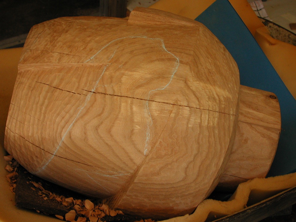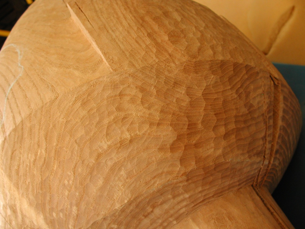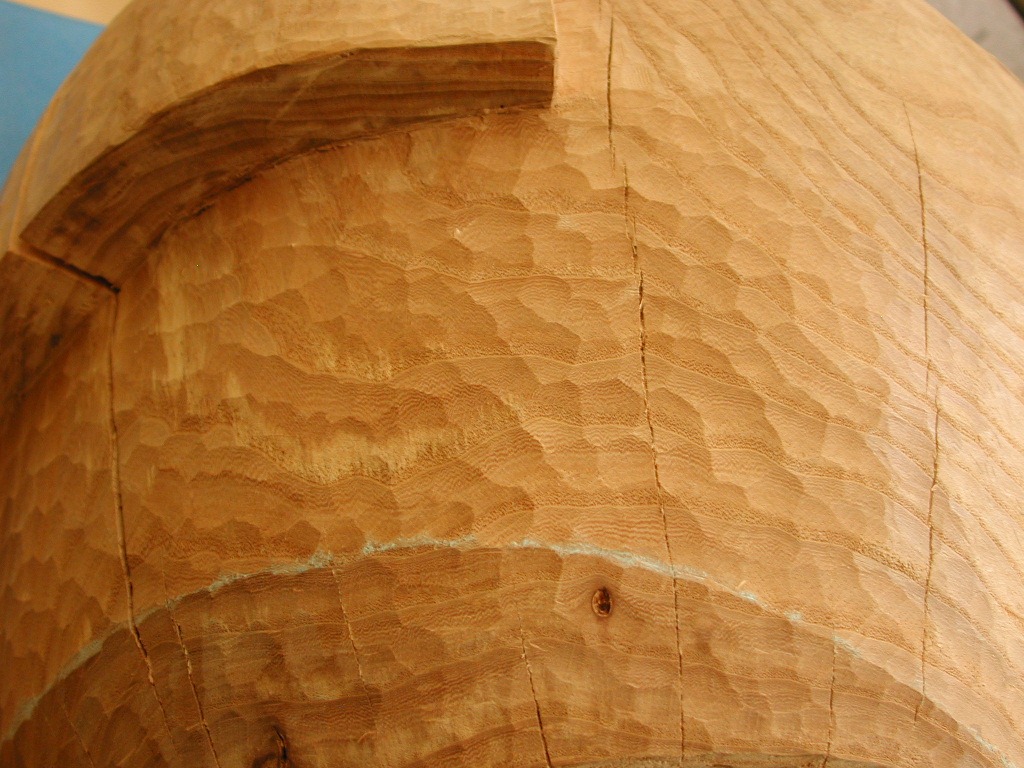 I use chalk to mark the areas where I still need to carve in and remove the smoother surfaces that were left from the surform tool.