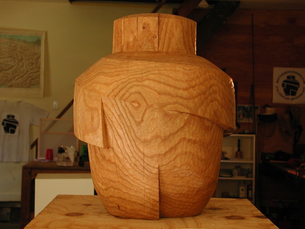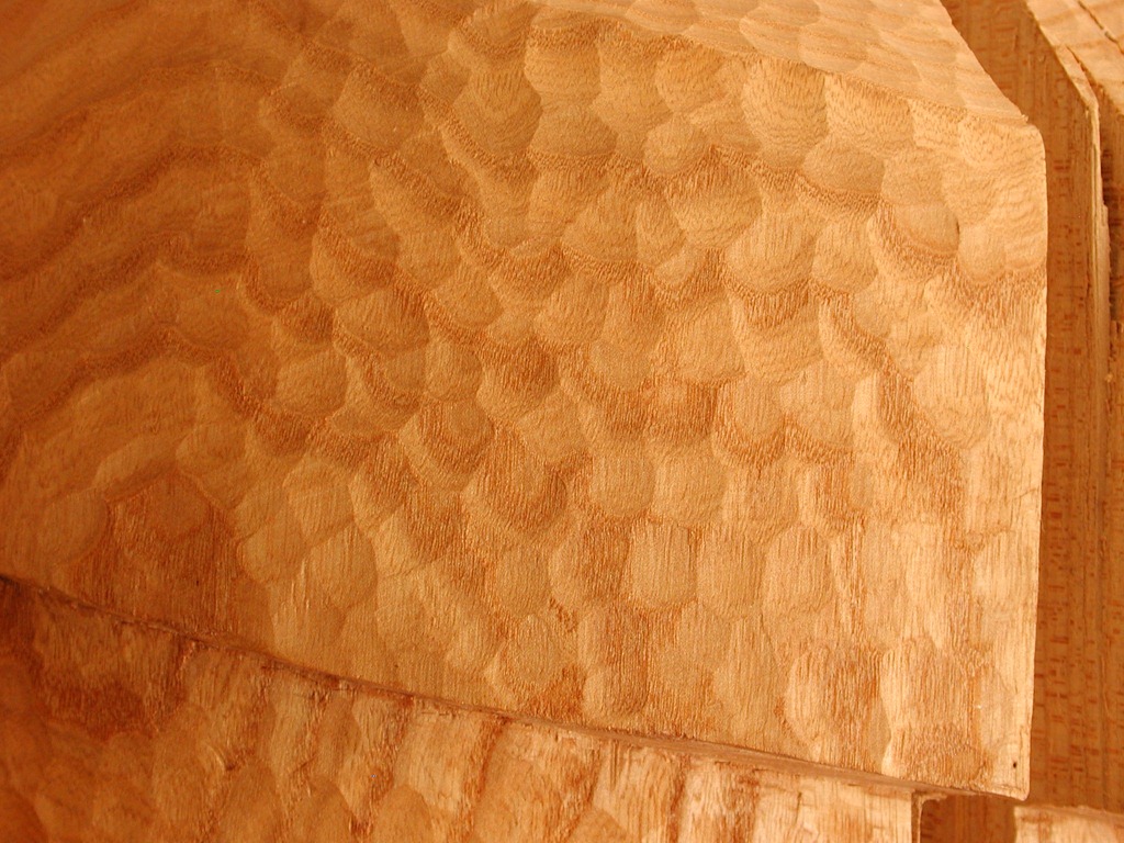 I used some ultra-secret 3000 grit sandpaper that comes on a thin foam backing, kind of like a mega-fine 3M pad (thanks Garry), to buff down the fine hairs and grain raised by the application of the first coat, especially around the equator of the piece where the grain is flat and difficult to chisel as sharply and cleanly as on the end grain at the top and bottom. The trick is not to dull the sharp edges of the chisel marks which are so nice, and this special sanding pad can do it much better that I could do on the practice piece with regular 2000 grit paper. This gave those areas a much “harder” surface, without the vaguely distracting fuzz of the loose hairs, which as hard as they are to see, still create a lack of visual sharpness.