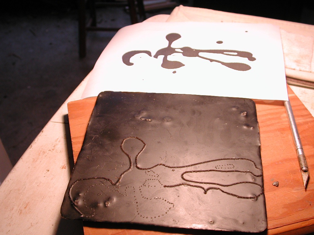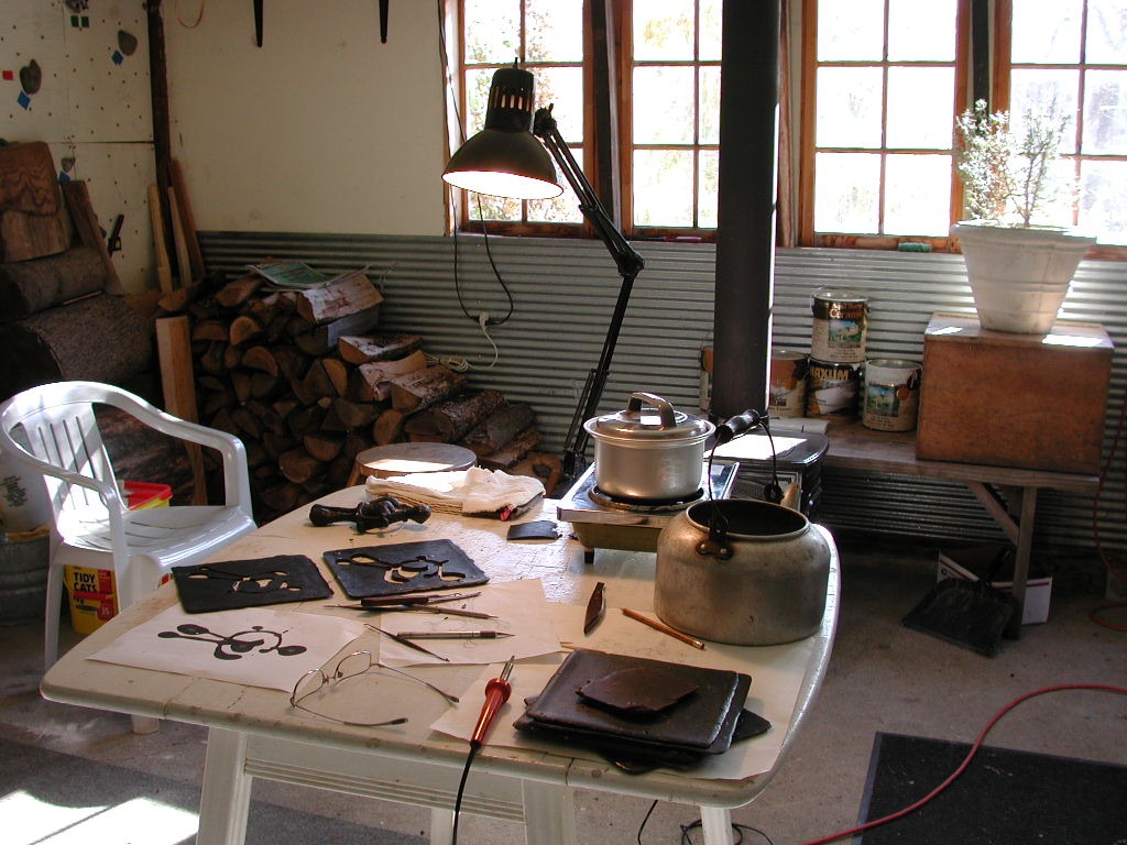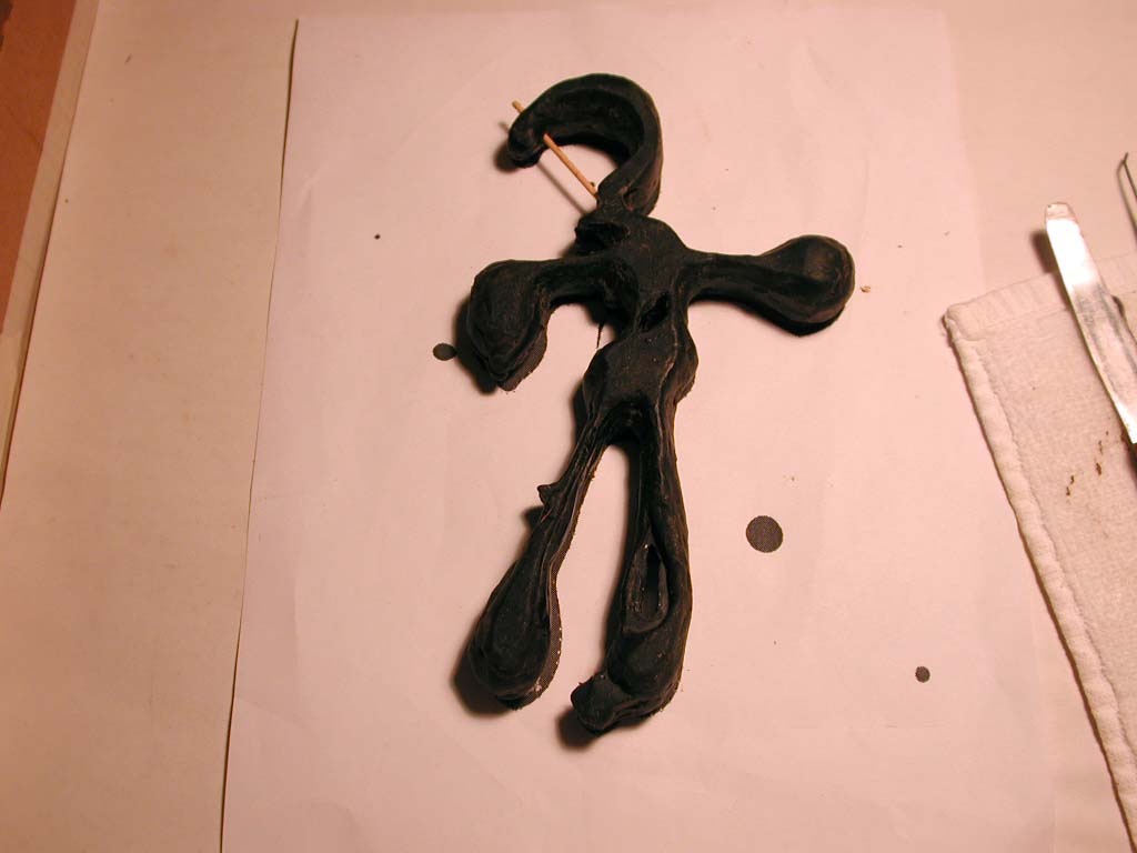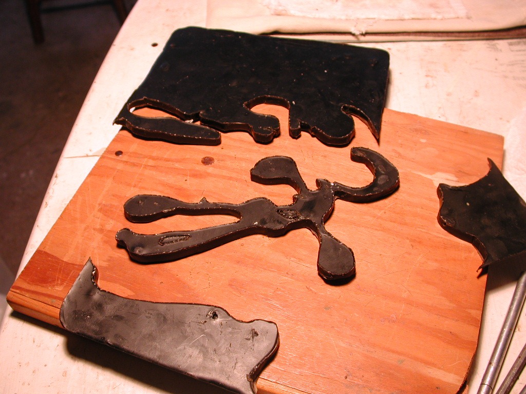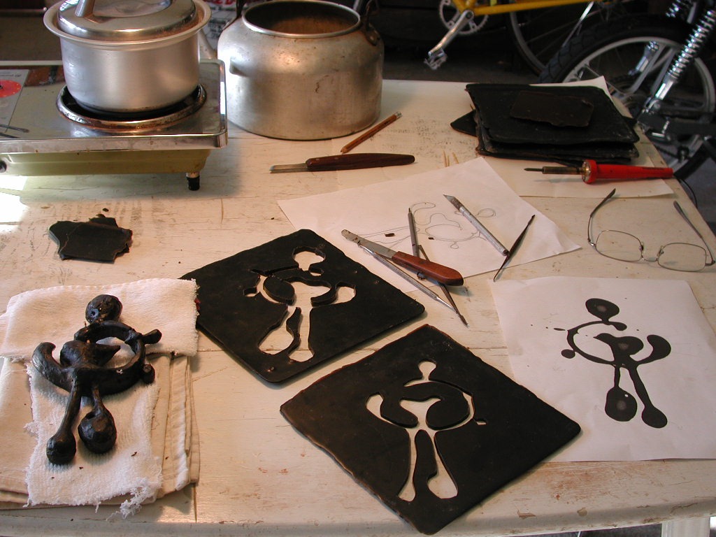 Since these are going to be bronze castings from wax models, I make some wax sheets, use the design as a template to cutout the figure, stack them up like a relief map, and add soft wax to flesh out the forms and emphasize the third dimension. Dip the whole thing in warm water and bend and shape it. Working outside in the barn with the wood stove going is actually very helpful; the cold air keeps the wax firm and holding it’s shape. Moving it nearer to the stove warms up the surface of the wax so you can smooth it, without warming the core so much that it starts moving where you don’t want it to. Take it outside for a few minutes to really get hard. When working with wax in the summertime it is all the time too soft to get decent results. It gets too soft to hold it’s shape right and you end up putting it in the icebox to chill and firm up. Of course you are sitting in the sun in a T shirt and shorts instead of long underwear and Carharts. On the other hand, Winter, you are not tempted to go skateboarding or swimming at the lake.
