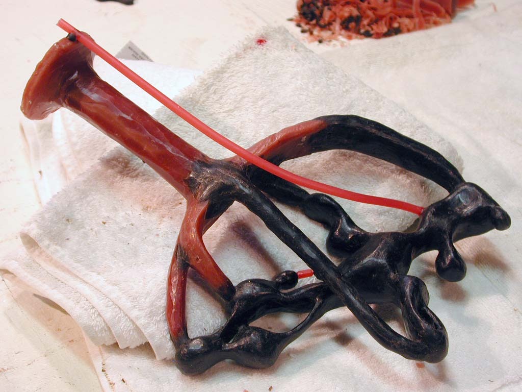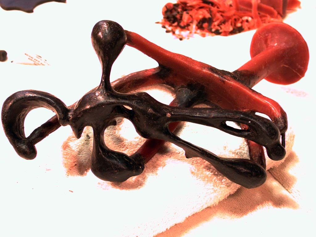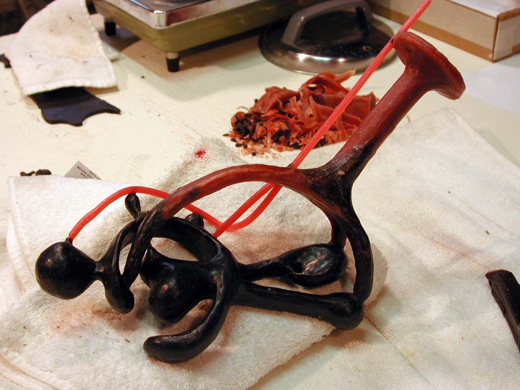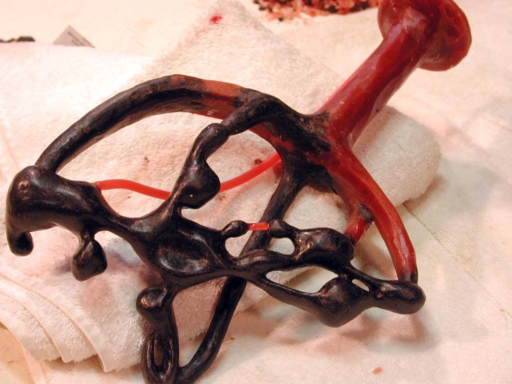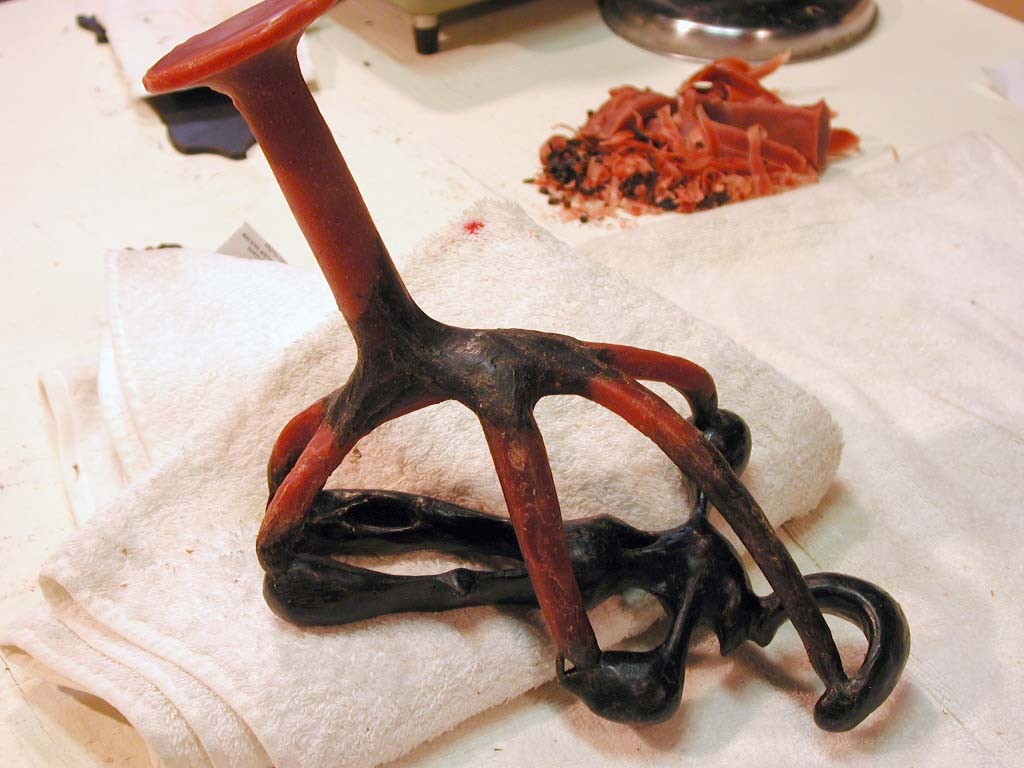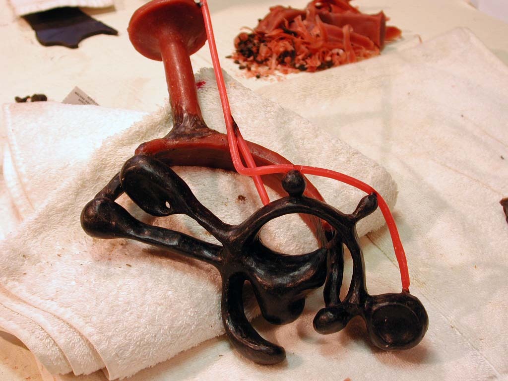 Now is the time to add the sprues to each piece. A sprue is a downward channel the bronze will follow into the mold. The mold should fill quickly, so that the metal doesn’t cool before the mold fills, and completely, so there is no area in which air is trapped, causing a void in the finished piece. This is a matter is visualizing the flow of metal through the piece as you turn it to discover the optimum position which will accomplish both. Of course, there is some intuition and experience involved too, and every piece must be considered uniquely. In some cases there are vents which give a path for air to leave the mold from areas where it might otherwise be trapped. I naturally tend to overdo this sort of thing, but since these pieces have some thin and narrow sections, I want to be sure that the metal will not “freeze-out” or cool anywhere, so I have placed a sprue into each hand foot and head to get metal into every area. As well, all those sprues can serve as vents too.
