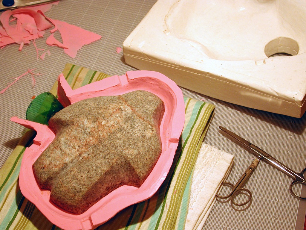 The first half mold finished. Plaster mother mold and silicone mold together.