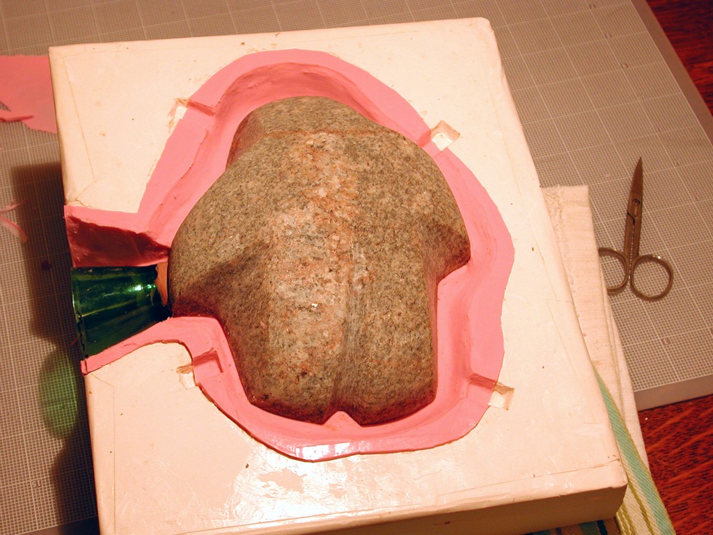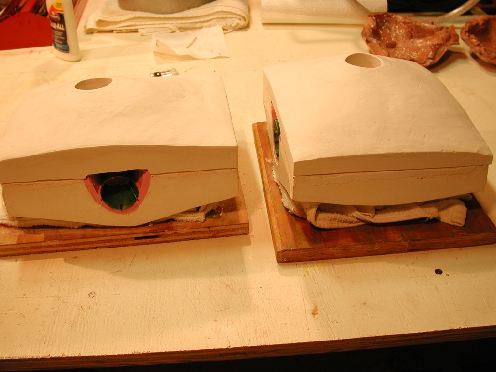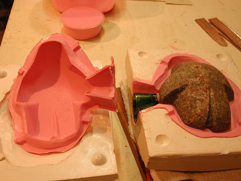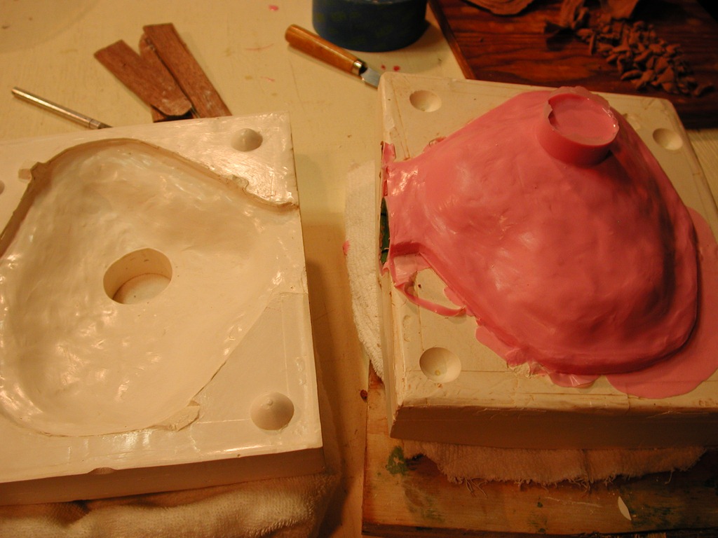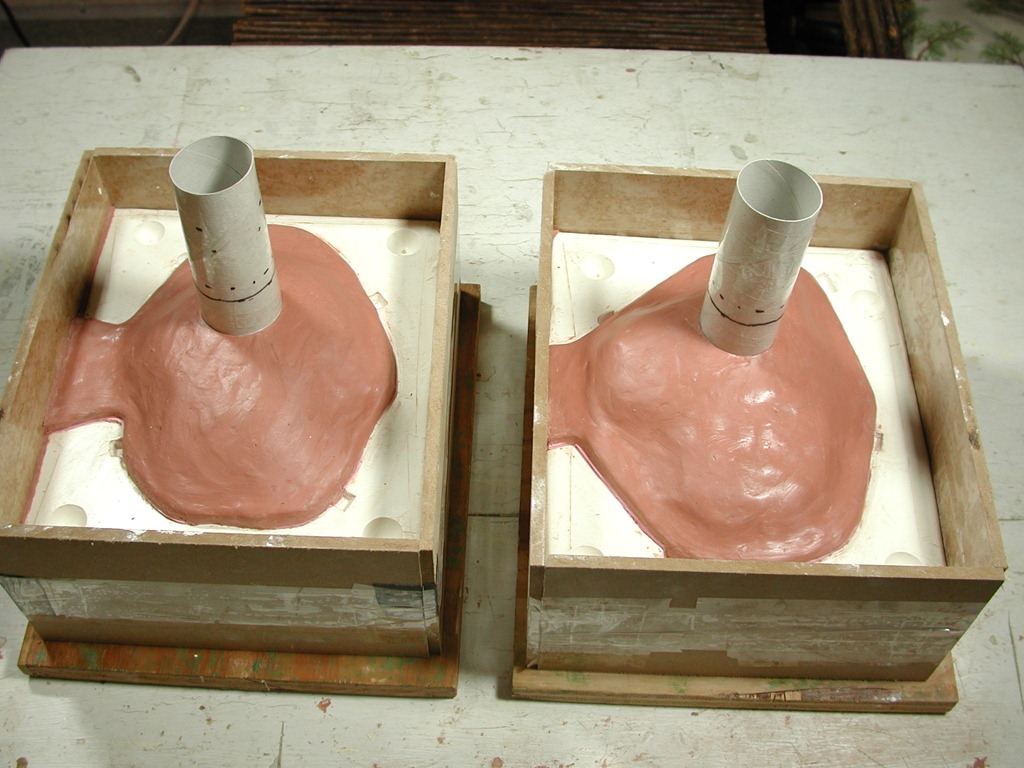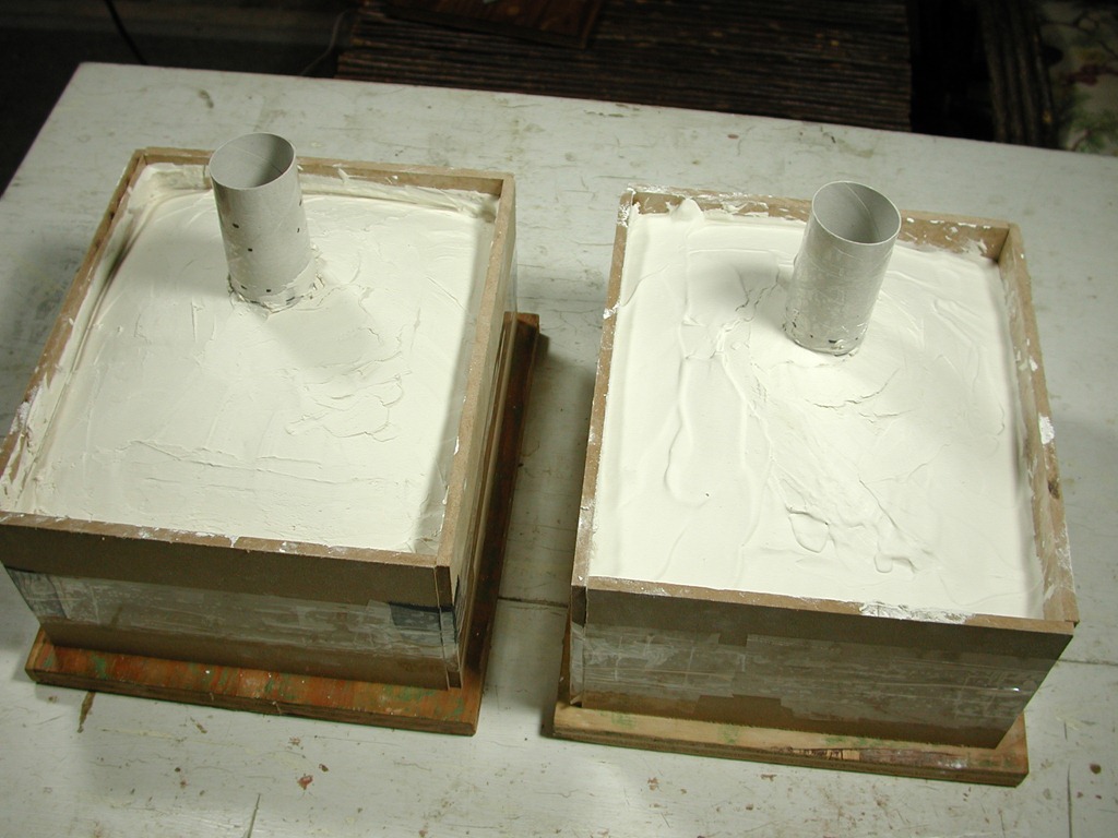 Ready for plaster to be poured; each mold boxed, with a pour sprue for the silicone. Seal edges of mold along the sides of the box to prevent leakage. Apply spray-on mold release liberally everywhere.