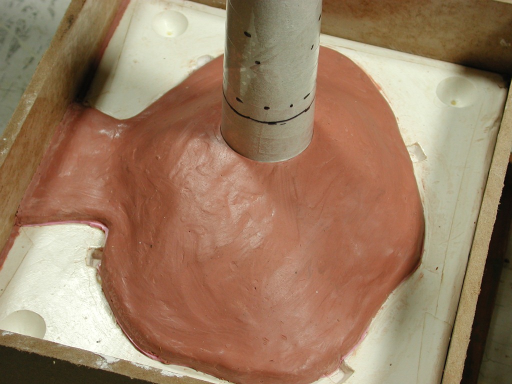 The silicone poured. See the clay seals around the sprue required to keep the silicone in the mold.