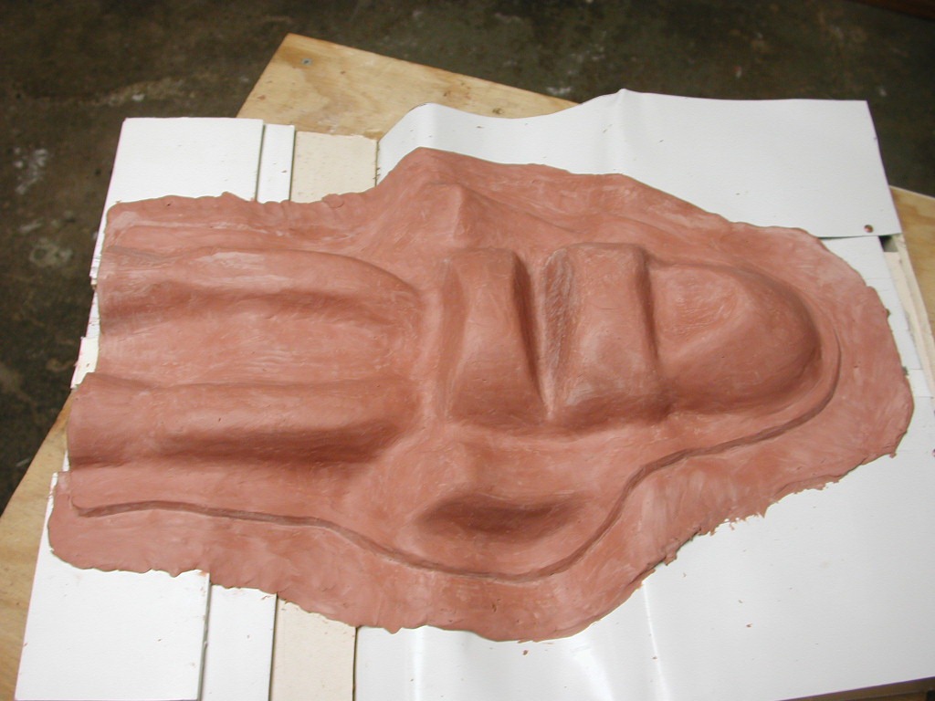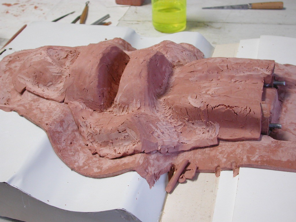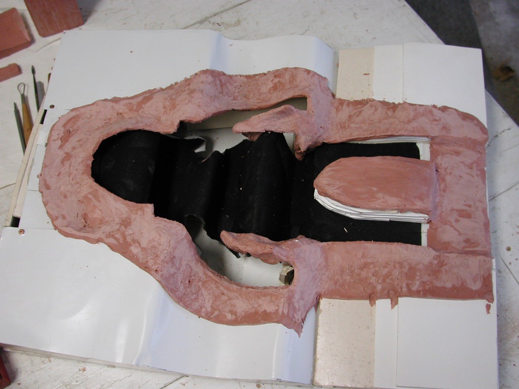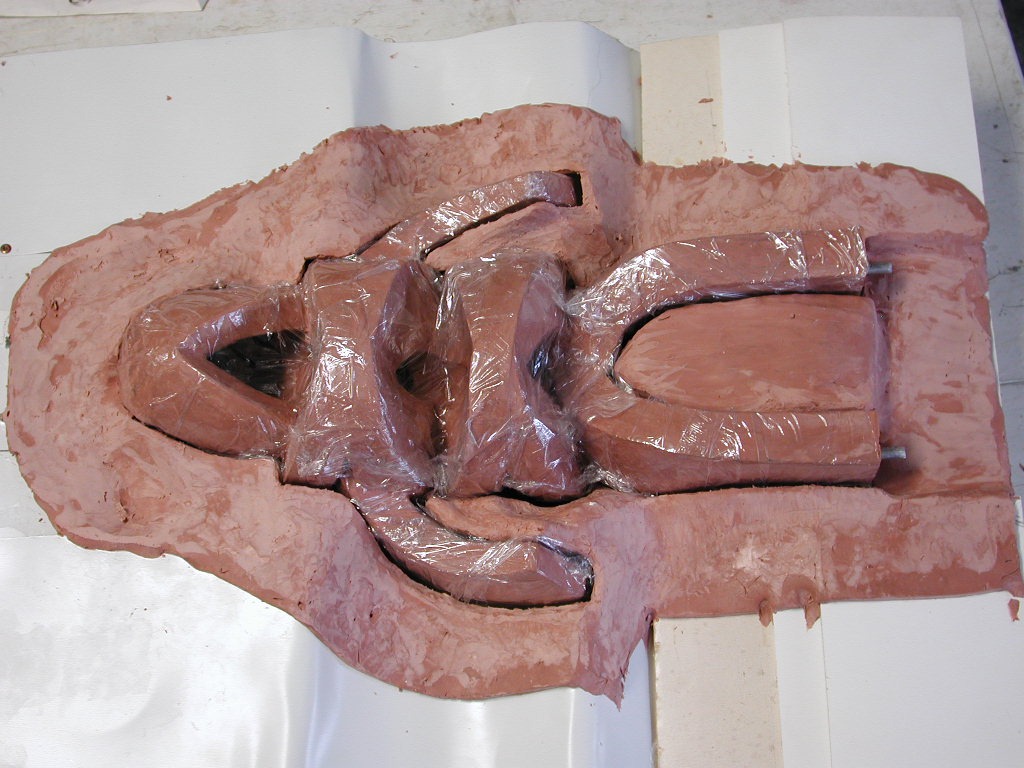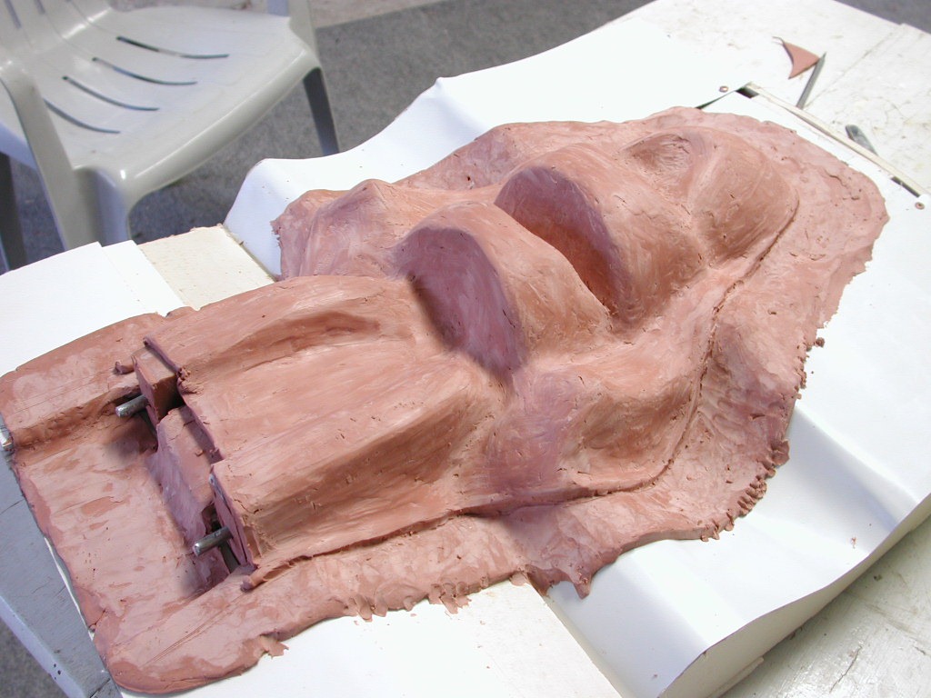 And I begin to cover it with a thin blanket of clay, about 3/8th inch thick. It is upon this blanket that the plaster mother mold will be poured. It is essential that there be no undercuts or catches which will bind the plaster to the clay surface, which itself will eventually be replaced by slicone rubber. As complex as my model is, I think this is evident to work OK.