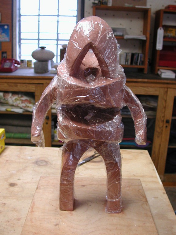 I wrap the model in plastic wrap to protect it from sticking to the clay blanket too much. This will come off later before I pour the silicone rubber inner mold.