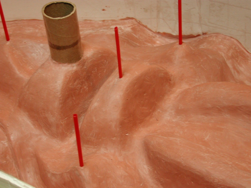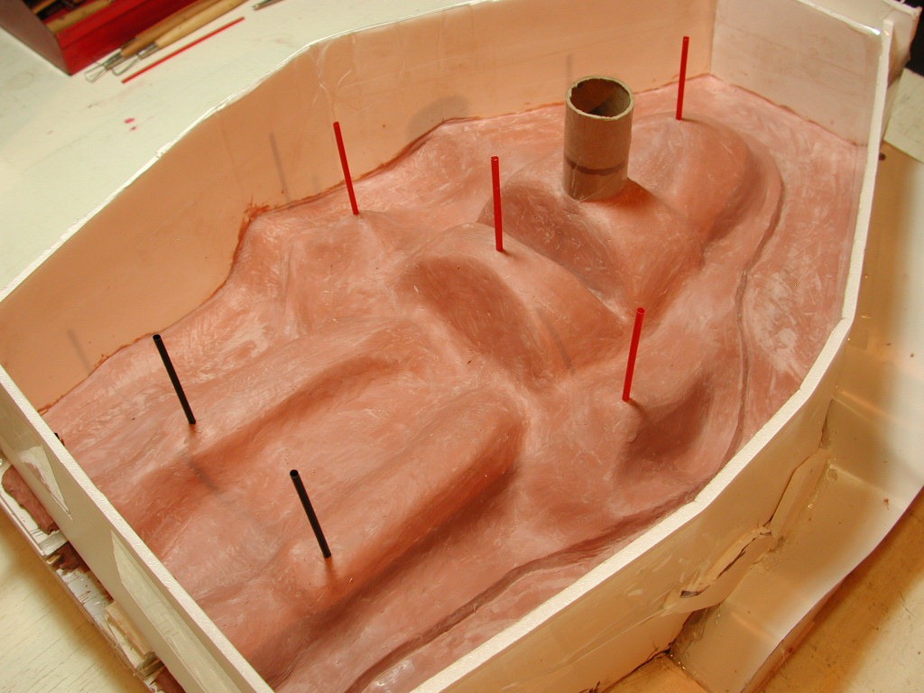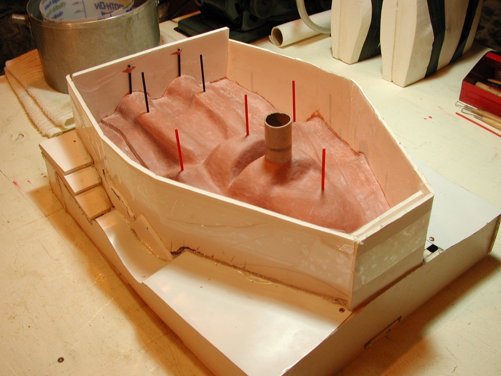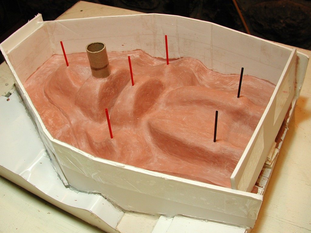 Here I’ve boxed in the front half, preparatory to pouring the plaster mother mold half. It includes a pour sprue and vents at all the high spots.