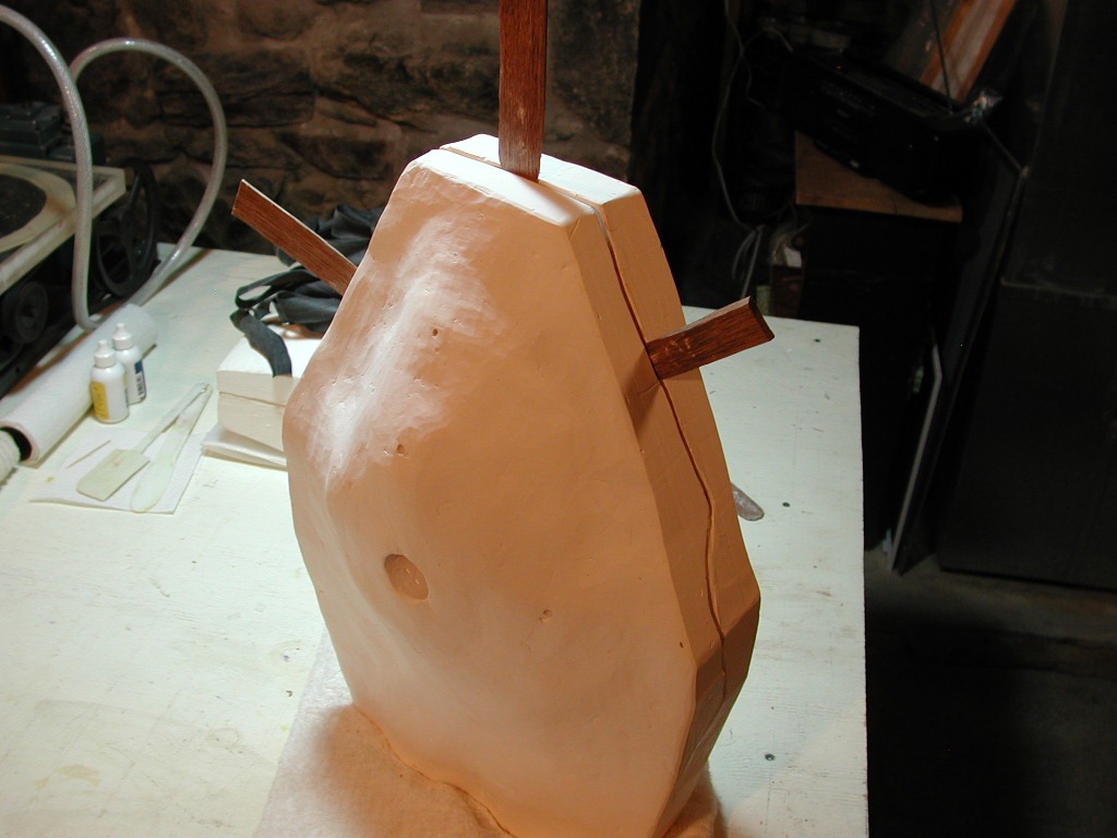 I had to go snowboarding again, sun and snow perfect, clear-minded oblivion. By now the plaster shell is really dry. I stand it up and very carefully, open it by inserting some wooden wedges and tap gently with a hammer. As soon as the suction is broken it comes apart easily. Do not pry. Be patient. I open the mold so as to reveal the first side that I worked on, that hasn’t seen daylight since the end of December. Nice, isn’t it? Face it, there is satisfaction in doing your craft right.