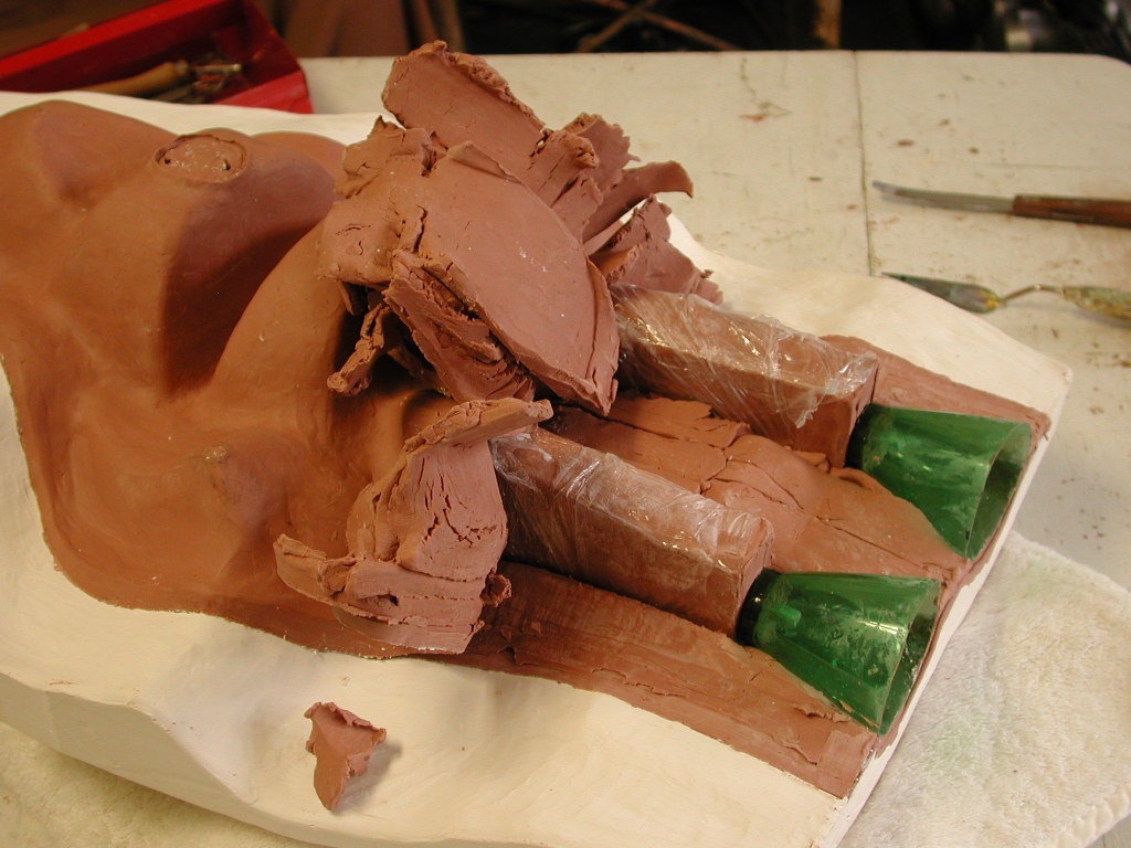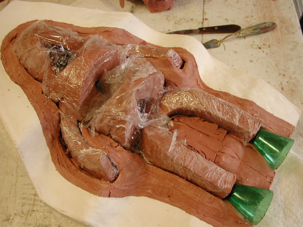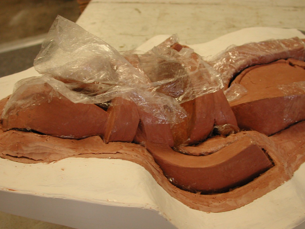 I cut back the plastic wrap with small scissors, which has been helping to protect the model from the clay blanket to the existing rough parting line,