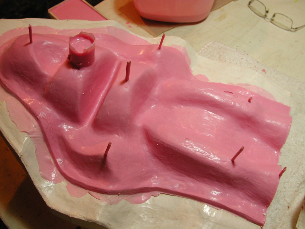 Interesting. See the air gap there on the belly of the figure? Although there had been oozing silicone out of that vent hole before it was plugged, there must have been some subsidence of the material while it was curing, leaving that void.