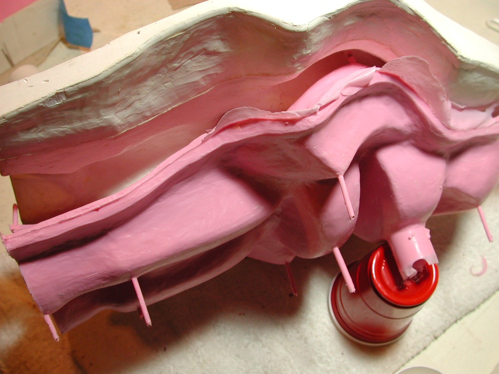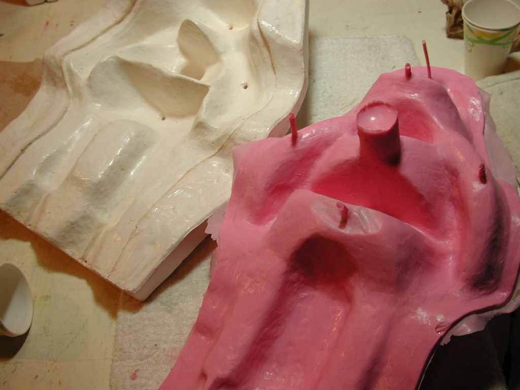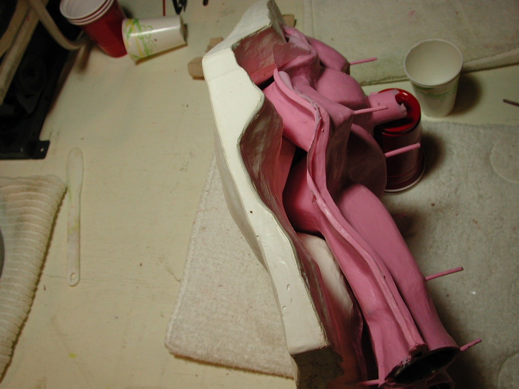 I’m doing the second side, the back side, of silicone mold. This repeats the steps done for the first, front, side. Of course, the mold is turned-over now. Apply a liberal amount of release to all the surfaces of the two halves, the one with the model sitting in the silicone of the front side, and the other, back side plaster. Where silicone will meet silicone there must be a barrier of release or else the two halves will bond permanently. It is surprisingly easy to neglect this for some reason, when one is pre-occupied with so many details to consider. I apply paste wax (Briwax) to the plaster, several coats, and a spray type release I’ve mentioned before, which is hydrocarbons in ether, or something. Works fantastic. I’ll say it again: APPLY A LIBERAL AMOUNT OF RELEASE TO ALL SURFACES. If you can’t remember clearly applying release, then do it again.