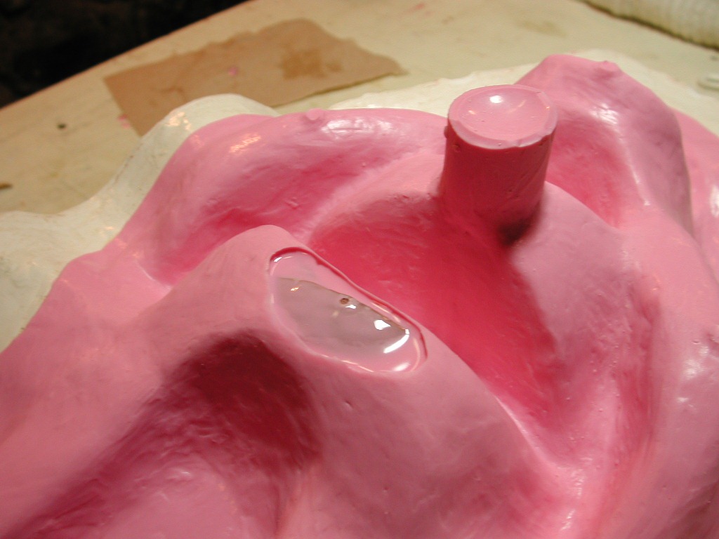I think it may be the same amount of material which found its way leaking into the foot-funnel. Or perhaps, because I forgot to seal the edges around the plaster half with the blue tape, air got into the mold and allowed the subsidence to happen. Otherwise, the clay plug should have secured vacuum to hold the silicone up. Who knows, but in this case it is easy to fix. I’ll re-assemble the mold and pour some silicone directly down the vent hole and fill the void. Since I will not apply any release to this area, the new materials will bond tightly to what’s there.