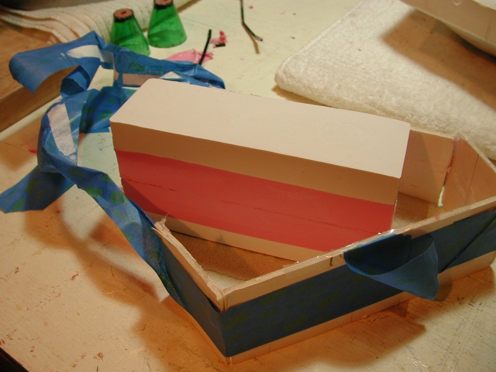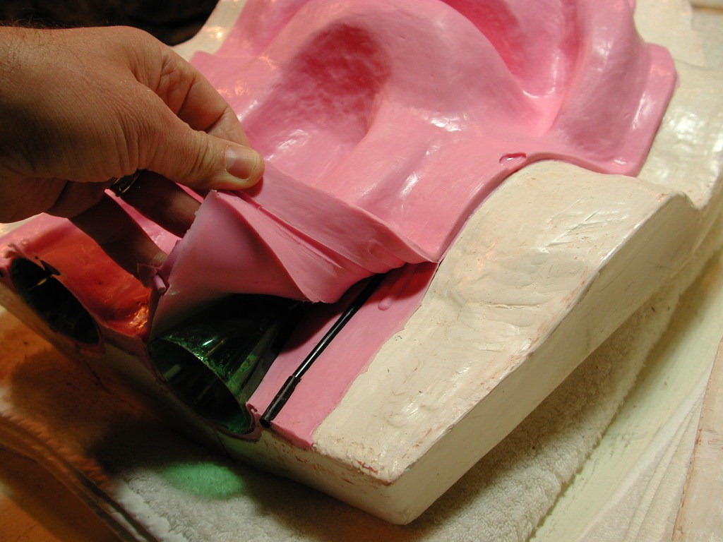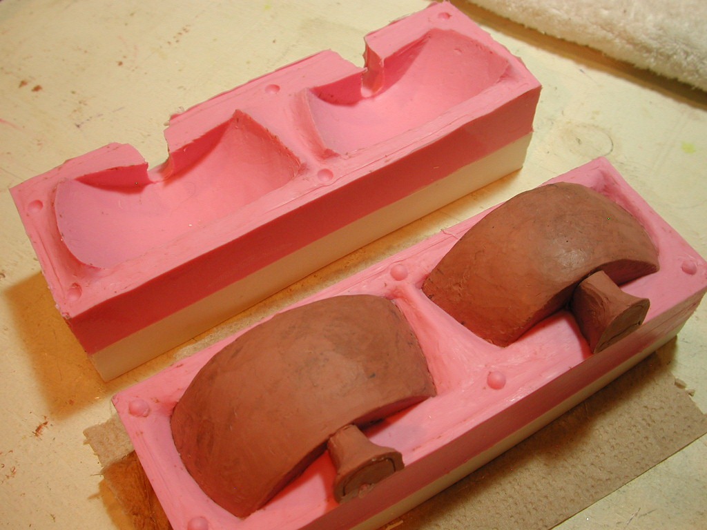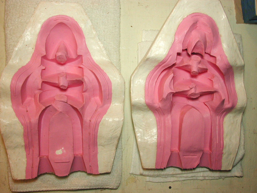 I surprise myself sometimes. With care and patience, I see that many difficult things are possible. The model, after so many months, now free, and in pretty good shape. And the two mold halves, complete. Complicated. It’s kind of amazing that all of that is two parts. The silicone rubber mold material is amazing.