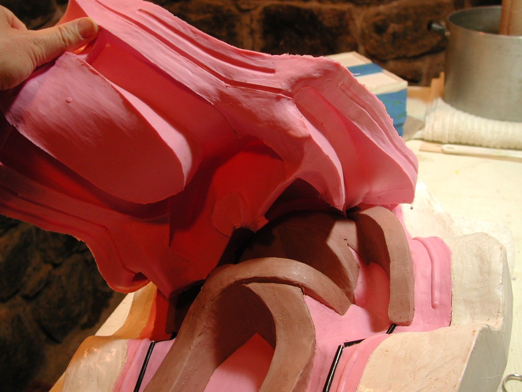 The deep crevices, and where there are holes through the model’s axis, are the trickiest, but because of the thinness of the mold layer, as I had planned and hoped, the mold bends away and removes easily enough, and cleanly, without tearing the model up any. That should mean my wax casts later will come out undamaged and with the minimum about of touchup needed.Those holes through the axis were critical in my planning of this piece from the beginning, in both the design of the model and the mold, and I am grateful that it all turned out so well.
