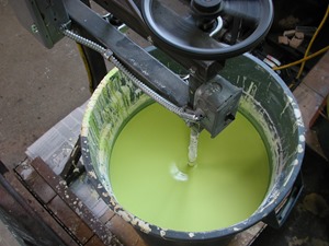 These are the materials which make the shell. Colloidal silica slurry mix, and refractory silica sand. You dip the piece into the slurry, and sieve the sand onto the wet surface. Repeat up to eight or twelve layers. This work is taking place at “H”’s studio foundry, a place well-equipped for this. I’d not be able to do any of this without his generosity in sharing with me his superb facility, and his supportive help and advice. (Thanks)