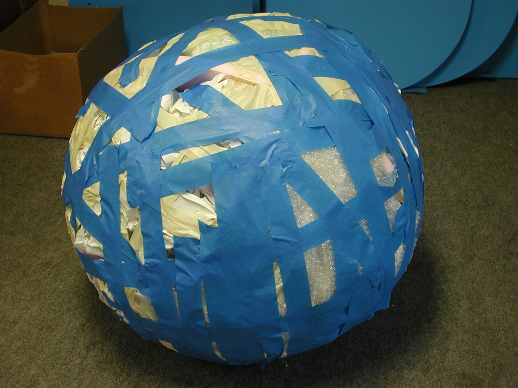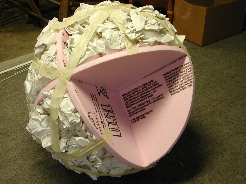 Begin to cover it with masking tape, layer upon layer, until the shape you want begins to have firmness and integrity. Something not right? Add more paper, packing peanuts, fiberglass insulation, and tape, tape, tape. Keep taping. Then add more tape. Finally, if it still doesn’t quite seem right, add more tape. And then, put a nice smooth finish layer of tape on top. This really works. Have faith. I used at least ten rolls of 60 yard masking tape. To get to this. She’s about 30"x30"x30" which is a large as will fit through a doorway.