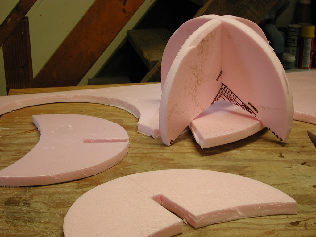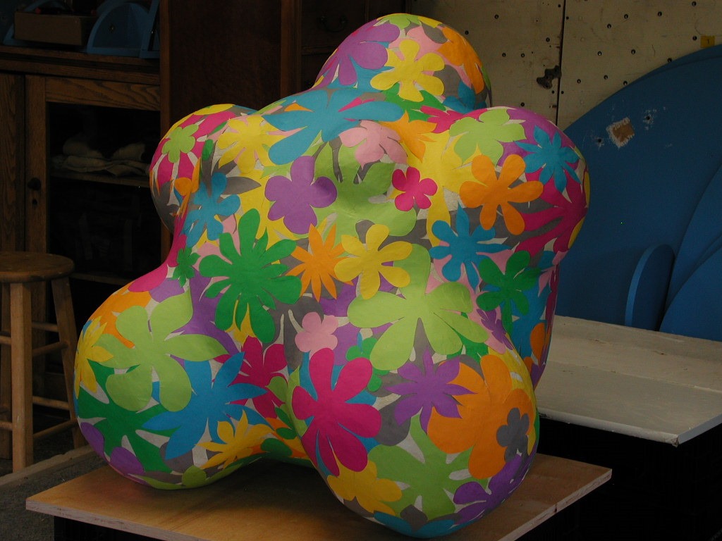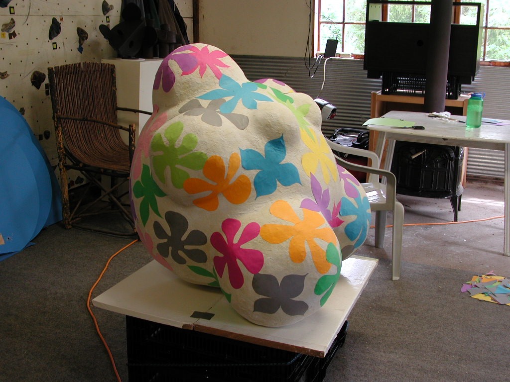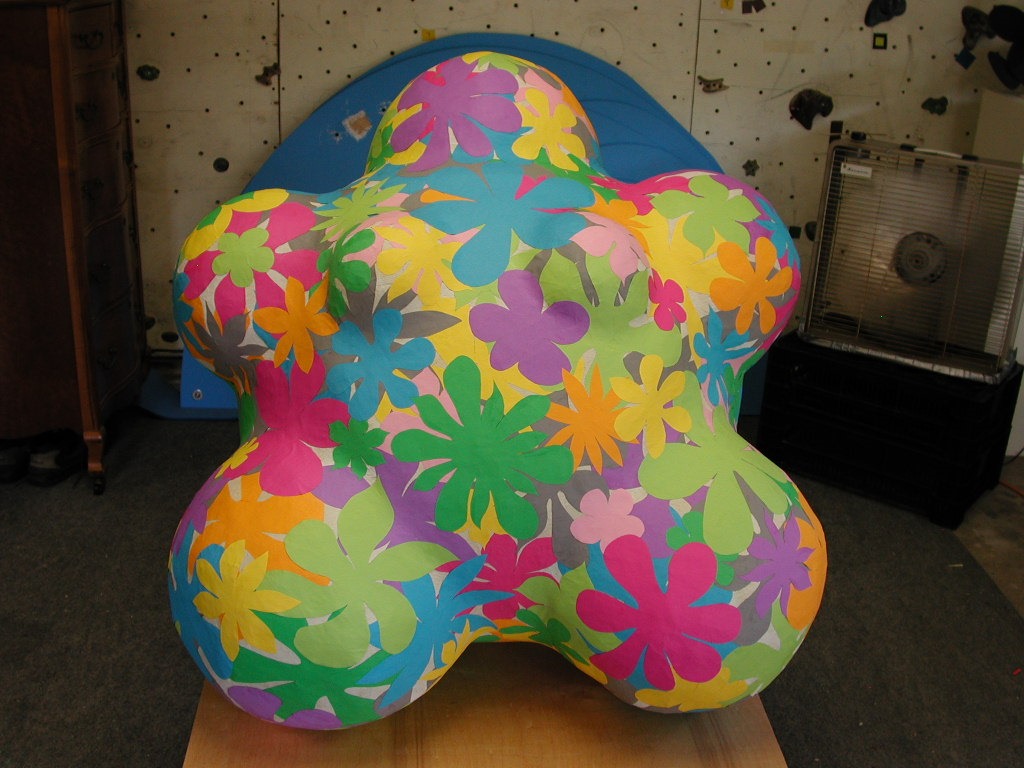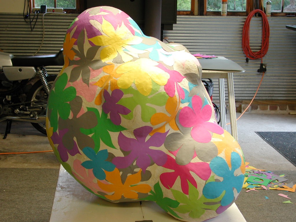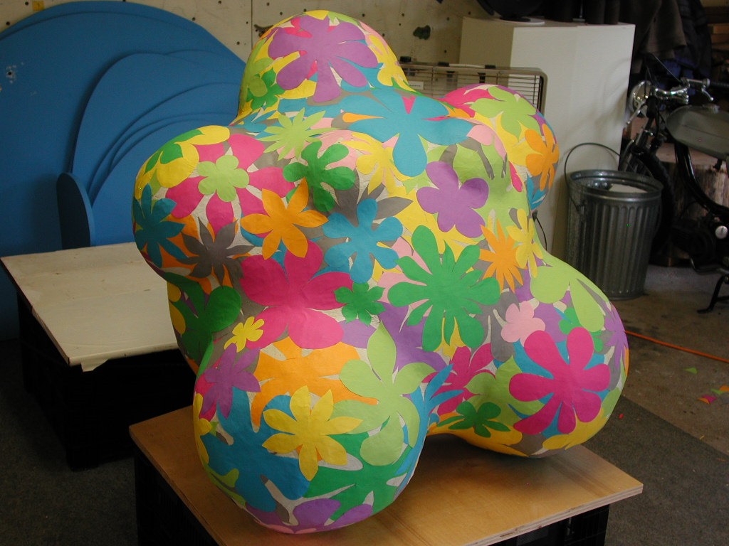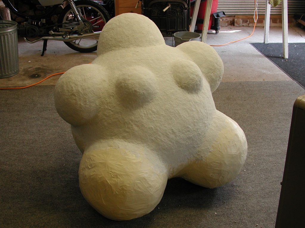 The construction is sketchy itself. The method is used for parade floats, mardi gras decorations, and the Fallas de Valencia. They’re not meant to be permanent, and they are large and need to be lightweight, cheap, and quick.  Build a core armature to the shape of your sculpture of whatever light and impermanent materials you have on-hand; foam, bubble wrap, wire mesh, cardboard, wood, paper.