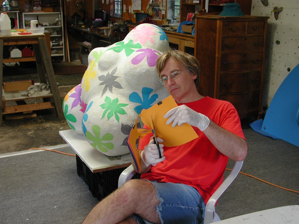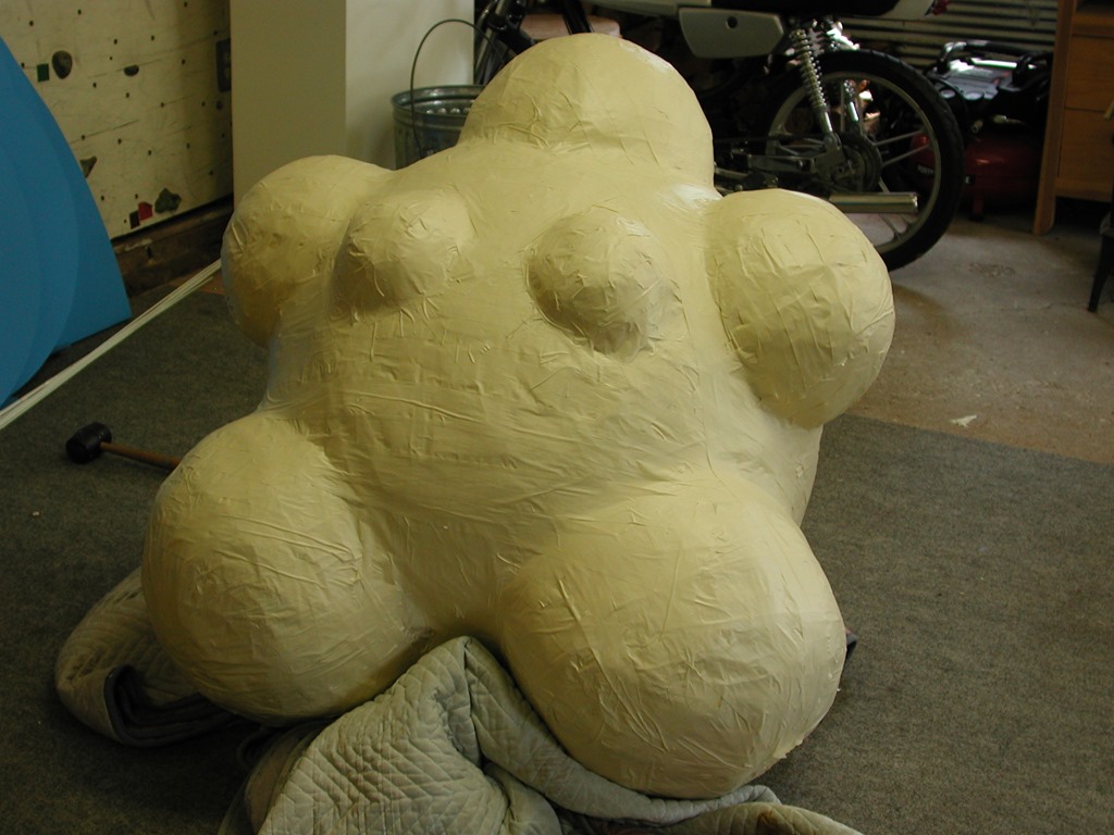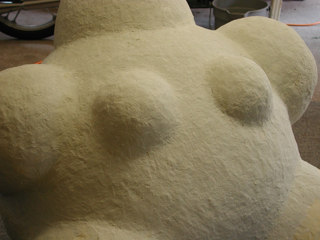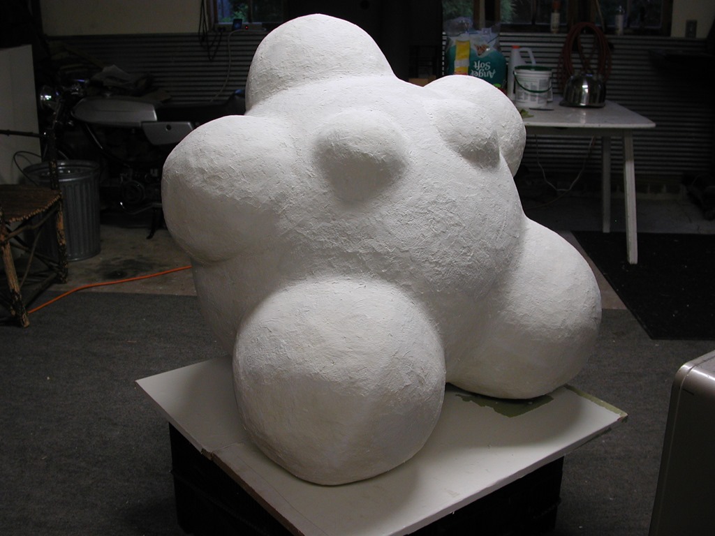 Next, prepare quantities of paper mache clay according to the popular way it is done now on the "internets". See: ultimatepapermache.com. There’s no point over thinking this; it has been figured out by very many creative "crafters" and you won’t find a better way, or at least any more well-tested way to do it. It is a strange mix of toilet paper pulp, drywall compound, Elmers glue, flour and linseed oil, and none of these things necessarily dry or cure in the same way, so I don’t know why it should work, but it does. Smear it on over your taped shape, just exactly like frosting a cake. Go in several thin layers, and dry it thoroughly between layers, by using large fans; this makes a big difference in the curing time. I used altogether 16(?) rolls of toilet paper, a gallon of drywall compound, and ¾ gallon of Elmers glue, or many small batches (16+). Take your time, play music, enjoy yourself, explore the details of troweling-on the mush; Spending time working in the studio is why you want to be an artist.