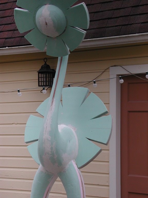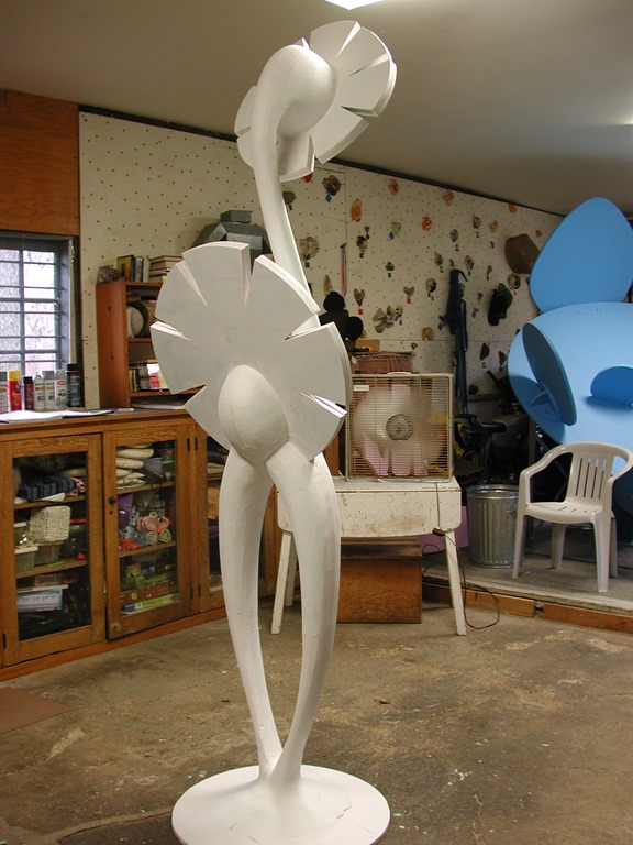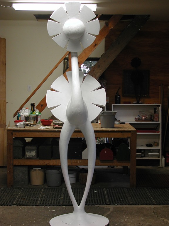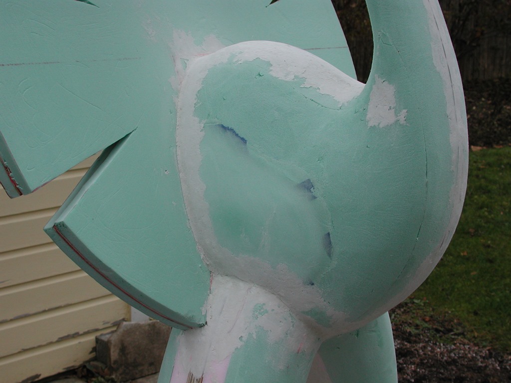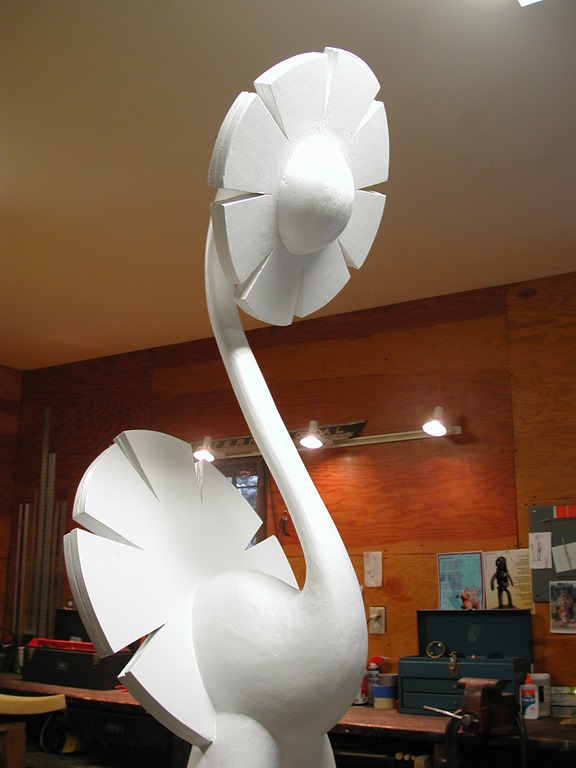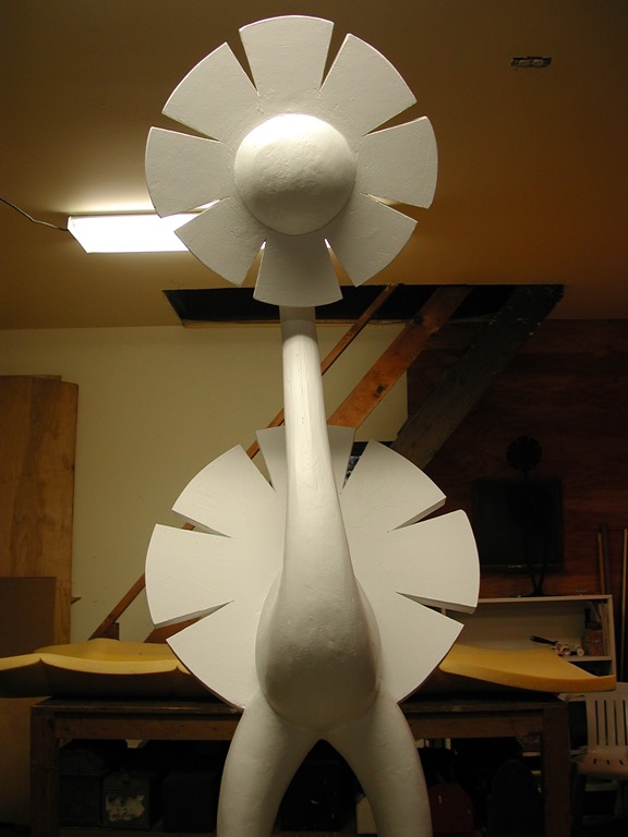 Surface-finish work begins. Patching with papier-mâché clay, sand, and then paint with appropriate primer for plastic foam (polystyrene). Then, overcoat with a high quality acrylic paint. All this helps strengthens the surface a bit, so it’s not so fragile to dents and nicks as the bare foam is. Getting somewhere like people think of real sculpture.