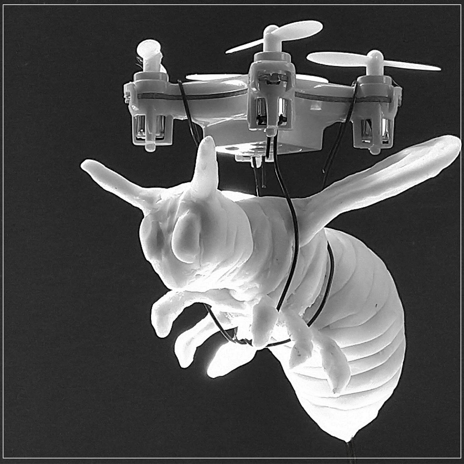 Bee, 2020, Glo-in-Dark Fimo clay and toy mini-drone. 5″x3″x3″.